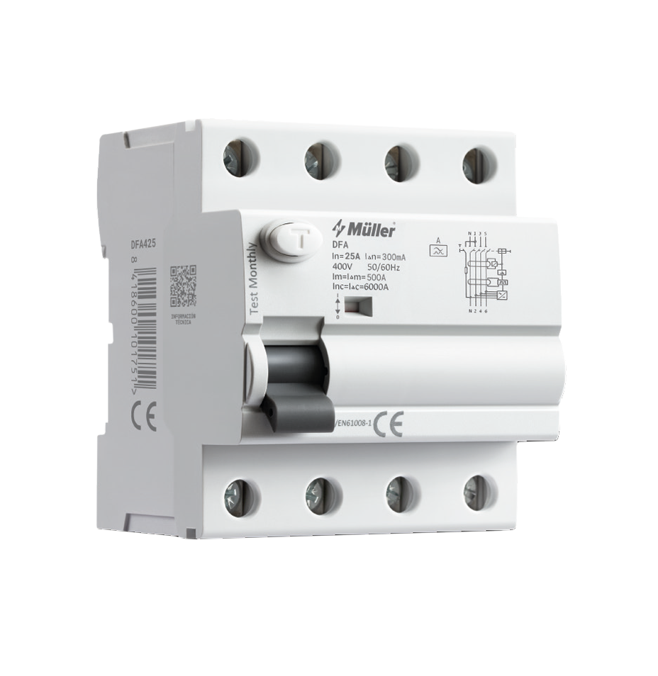 El interruptor automático diferencial de corriente residual Clase A de la serie DFA es adecuado para circuitos de AC 50/60 Hz, con una tensión nominal de 230 V para 2 polos y 400 V para 4 polos, y una corriente nominal de hasta 100 A.